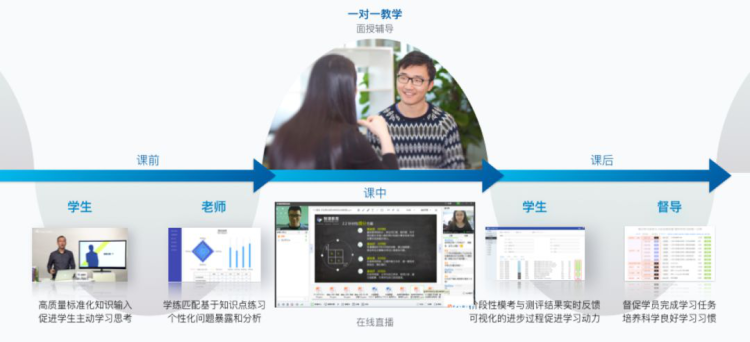 课前:基于云端存储的高质量标准化的专家课在线学习与练习,完成标准化的知识输入与基于知识点的在线练习强化对知识点的运用和掌握,学习过程与学习结果通过系统记录和反馈。