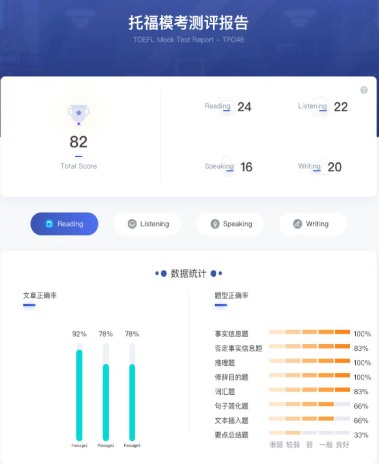 学习结果智能反馈。Smart系统搭载练习题库、模考平台、单词测试与精听精读等学习工具,学生完成后,系统自动测评打分反馈结果,客观分析学生分数表现,更为个性化辅导提供数据结果依据,使1V1辅导更具个性化和针对性。