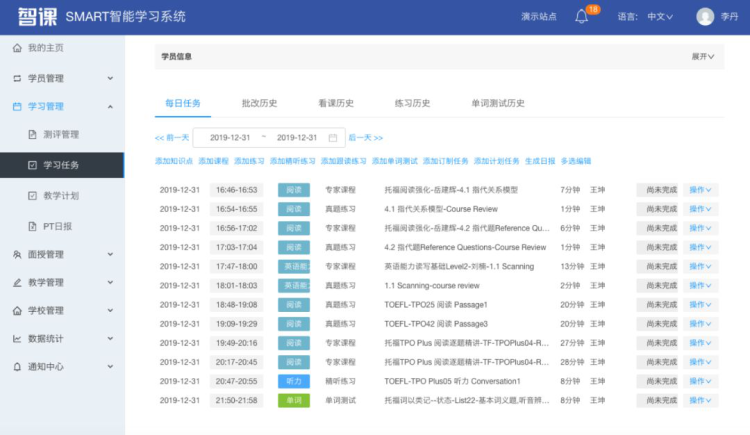 管理精细化系统化。老师基于当天学习目标远程安排学习任务,学习内容包含模考测评、专家课、在线练习、单词测试、精听跟读训练以及教学老师安排布置的自定义任务。