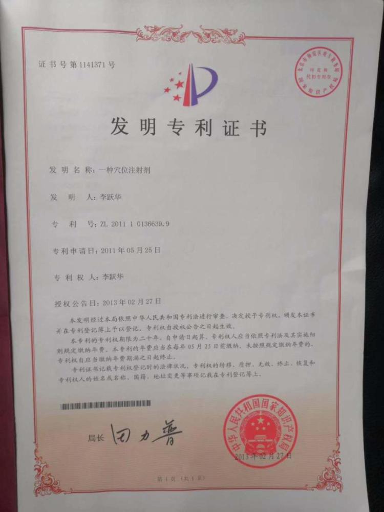2011年李跃华申请了国家专利,专利名称即“一种穴位注射剂”,专利号CN201110136639.9。在这个发明专利证书中,有明确的表述“本发明中苯酚为主要的治疗药品”。