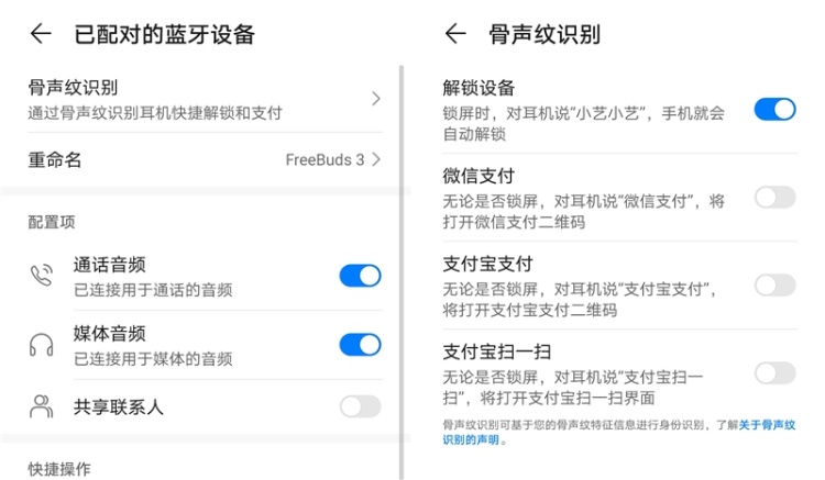 使用华为FreeBuds 3和一台手机,在最新的固件下就能在蓝牙配置界面中,解锁全新的骨声纹功能。点进菜单,选择骨声纹识别,就能看到升级全新骨声纹识别功能后,华为FreeBuds 3所支持的四项实际应用。