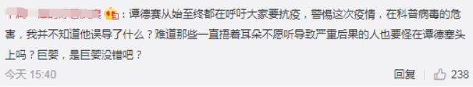 但还有大陆网民称,谭德赛从始至终都在呼吁大家要抗疫,警惕这次疫情,在科普病毒的危害,我并不知道他误导了什么?难道那些一直捂着耳朵不愿听导致严重后果的人也要怪在谭德塞头上吗?↓
