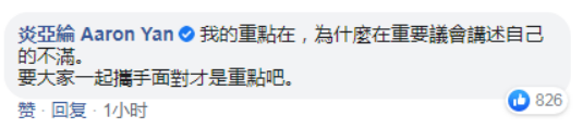 时隔近2小时,今天下午14时16分,炎亚纶在该条贴文的评论区留言解释说,“我的重点在,为什么在重要议会讲述自己的不满。要大家一起携手面对才是重点吧。”↓