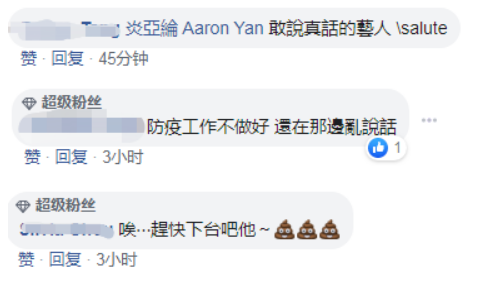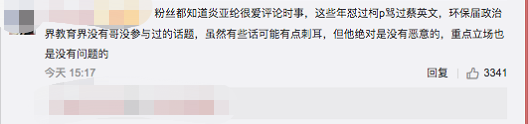 也有人留言评论称,“粉丝都知道炎亚纶很爱评论时事,这些年怼过柯文哲骂过蔡英文 ,环保届政治界教育界没有他没参与过的话题,但他绝对是没有恶意,重点立场也是没有问题的”↓