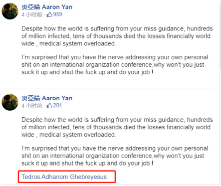 今天(9日)中午12时33分,炎亚纶在其脸书以英文指责谭德塞“误导”世界,还指责称“你竟然有勇气在一次国际组织会议上发表你自己个人的屎一样的言论”,“你为什么不干脆闭嘴、闭上你的臭嘴,做好自己的工作!”同时附上了谭德塞脸书的链接,随后他又对贴文进行编辑,去掉了此链接。