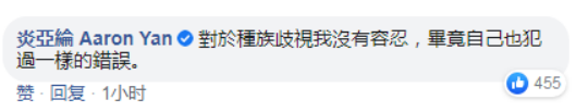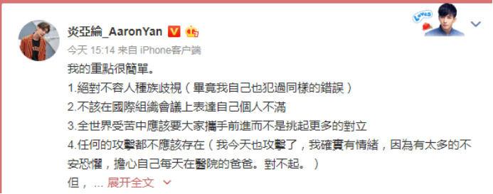 今天下午15时14分,炎亚纶在微博发文对其脸书内容“解释”称,他的重点是“绝对不容人种族歧视;不该在国际组织会议上表达自己个人不满;全世界受苦中应该要大家携手前进而不是挑起更多的对立;任何的攻击都不应该存在”。 他说自己今天也攻击了,确实有情绪,“因为有太多的不安恐惧,担心自己每天在医院的爸爸。对不起。”并在文中呼吁网民“勿上纲上线”。