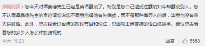 有大陆网民则认为,炎亚纶今天对谭德塞已经是言语霸凌了。 炎亚纶不认同谭德塞的言论可以说不同意觉得他有失偏颇,而不是那种侮辱人的话,毕竟谭德塞没有率先讲脏话。该网民还表示,炎亚纶应该看过台湾的政论节目和论坛,里面攻击谭德塞的话白纸黑字。建议炎亚纶去看看他的“家乡人”怎么种族歧视的。↓ · 蔡英文立马“抗议”,竟还发了个邀请