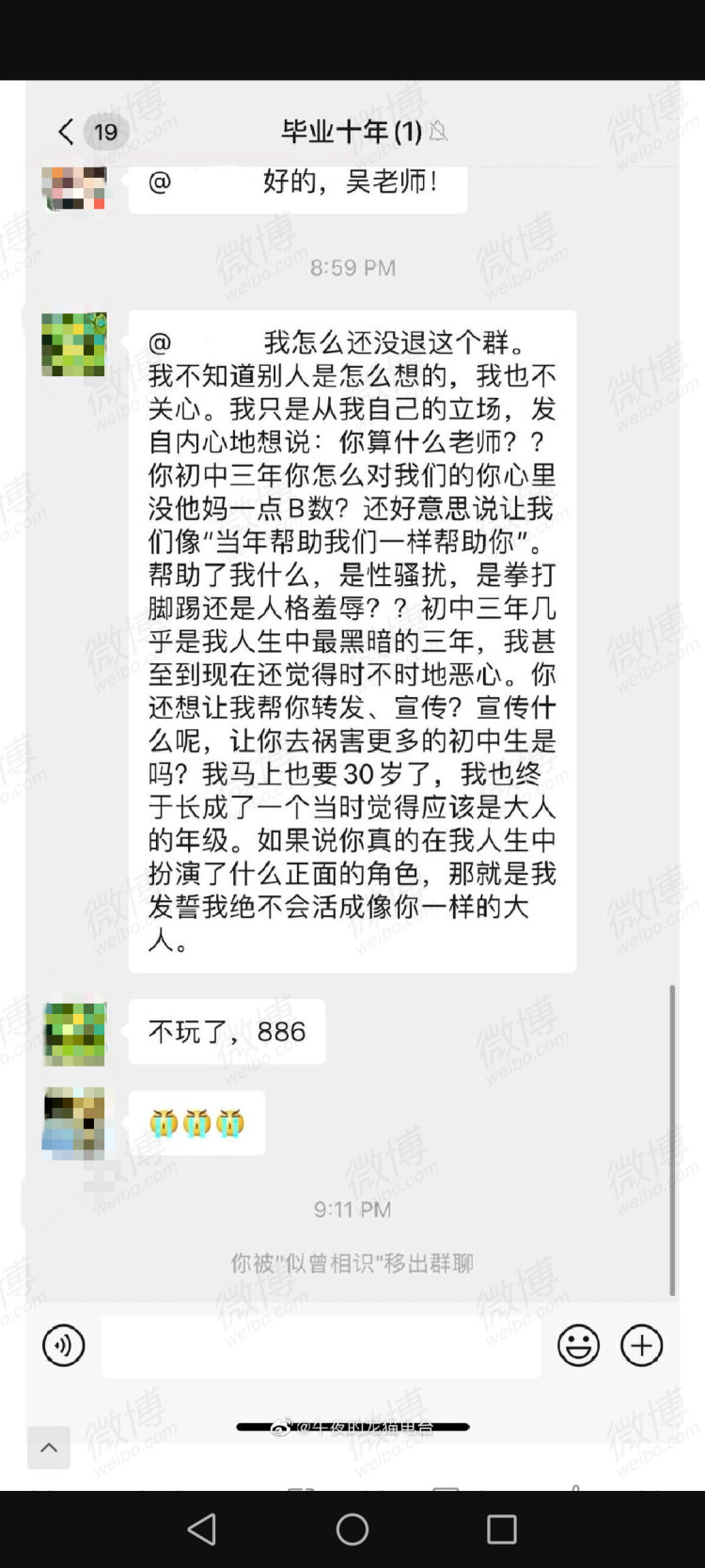 小张在微信同学中发信息指吴某性骚扰和殴打学生,后被移出群聊。 受访者提供小张称自己是受害人之一。
