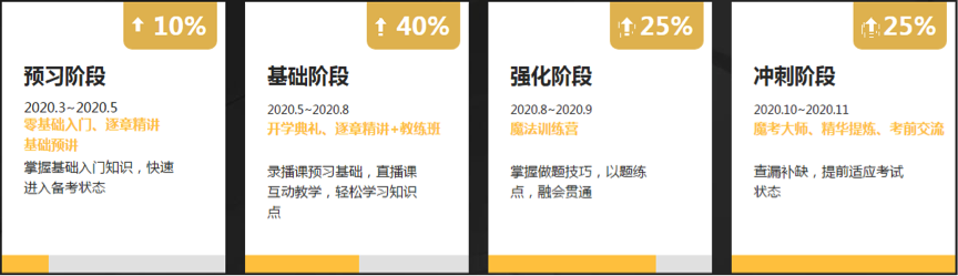 冲刺阶段:10月到11月进入考前冲刺阶段,有魔考大师、精华提炼、考前交流等环节,帮助考生查漏补缺,提前适应考试状态。