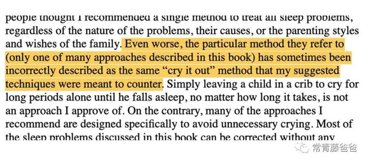 他说,他在书里面介绍了那么多科普类的信息,也列举了很多方法,可是人们还是简单又粗暴地认为他的方法就是把孩子放在那里哭,不要管,甚至直接总结为“cry it out” (哭声免疫),这个是非常不正确的理解。