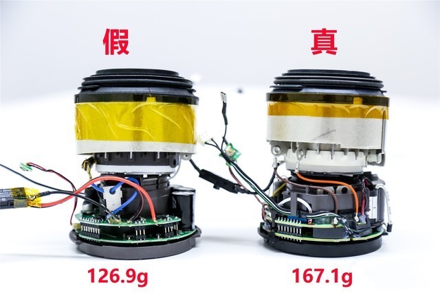 比较核心的风圈处的拆解,首先是重量上的差异,正品的重量达到了167.1g,假的只有126.9g,从侧面也可以看出正品戴森吹风机的用料更加扎实。