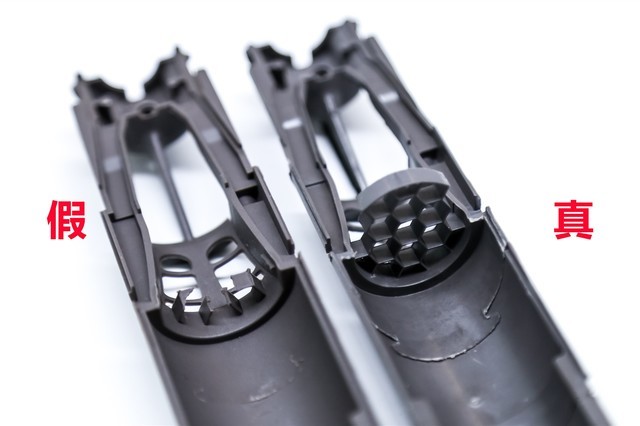 正品戴森吹风机的后盖采用了物理气相沉积(PVD)的技术来实现彩色的外观,这种技术不但能够实现更均匀的喷涂,而且还能增加产品外壳的耐磨度、强度等功能。假戴森吹风机则采用了最基本的喷漆方式,除了视觉上的喷漆不均匀外,在对比后也能看出明显的色差。