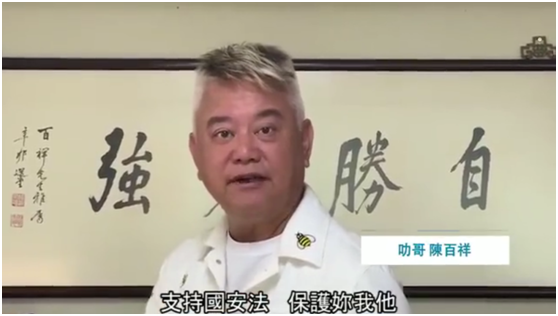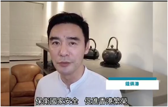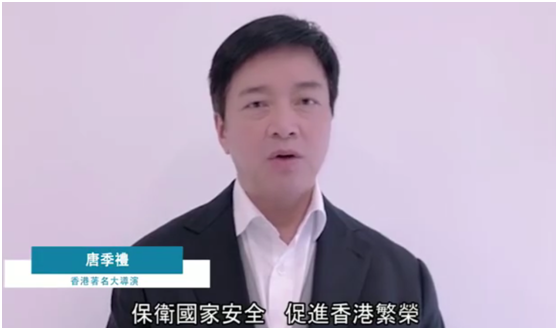 在这段全长45秒的视频中, 6名香港演艺界著名人士发声撑“港区国安法”,包括:著名演员成龙、陈百祥,天马电影老板黄百鸣、著名演员陈欣健、著名导演唐季礼,以及著名歌手钟镇涛等。
