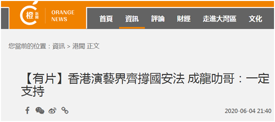其中,成龙表示,他十分支持拥护涉港国安立法。↓