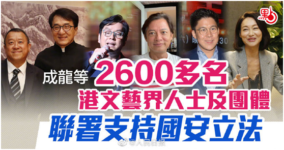 此前5月29日,成龙、谭咏麟、汪明荃、曾志伟、惠英红、陈小春等逾2600名香港文化演艺界人士及中国文联香港会员总会等团体发表联署声明,支持涉港国安立法。声明说,文化演艺界充分理解维护国家安全对香港至关重要,支持全国人大就香港国安立法所作的决定。