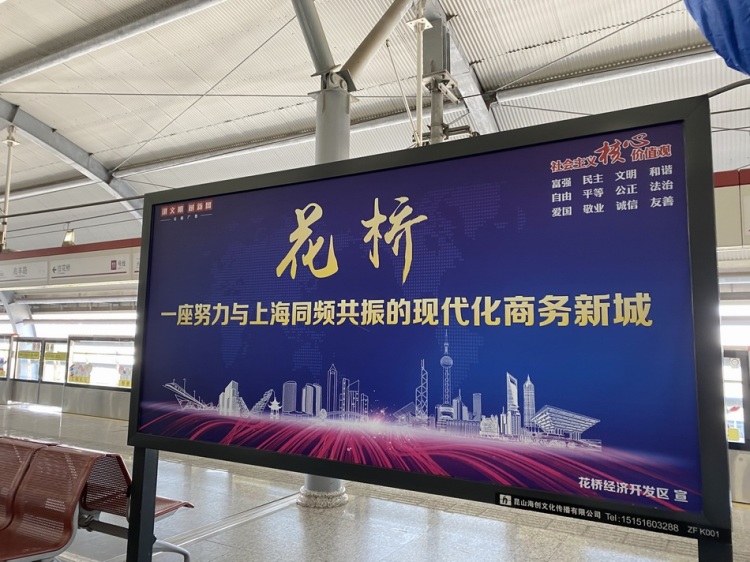11号线兆丰路站 澎湃新闻记者 陈逸欣 摄兆丰路地铁站内有一块醒目的公益广告:一座努力与上海同频共振的现代化商务新城。