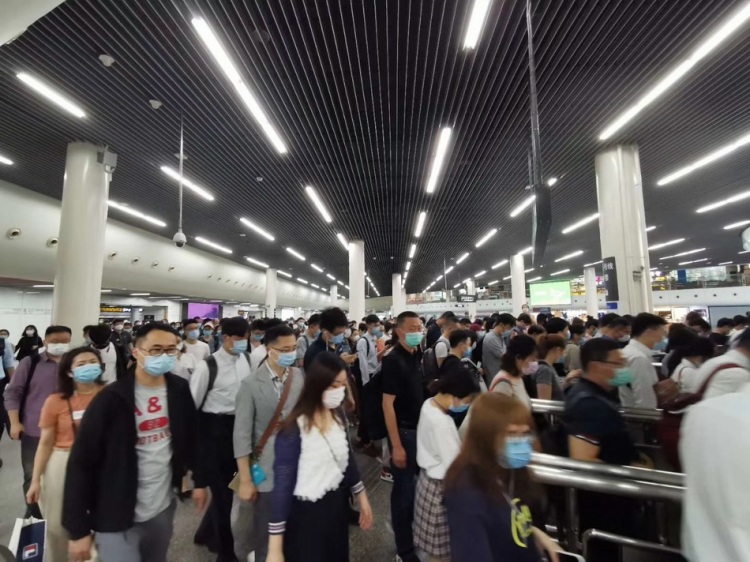 一次下班后他去世纪大道吃饭,出站时震惊了,直通世纪汇商场的8号口前排了长长一队,“开始以为是商场搞活动,结果发现只是大家在排队有序进站。”