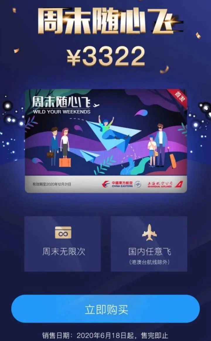 先来回顾一下东航此前发布的首创产品:在2020年内的任意周六和周日,旅客以3322元的特价购买该产品并激活后,可不限次数乘坐东航和上航航班,畅飞国内除港澳台地区外的各大城市。