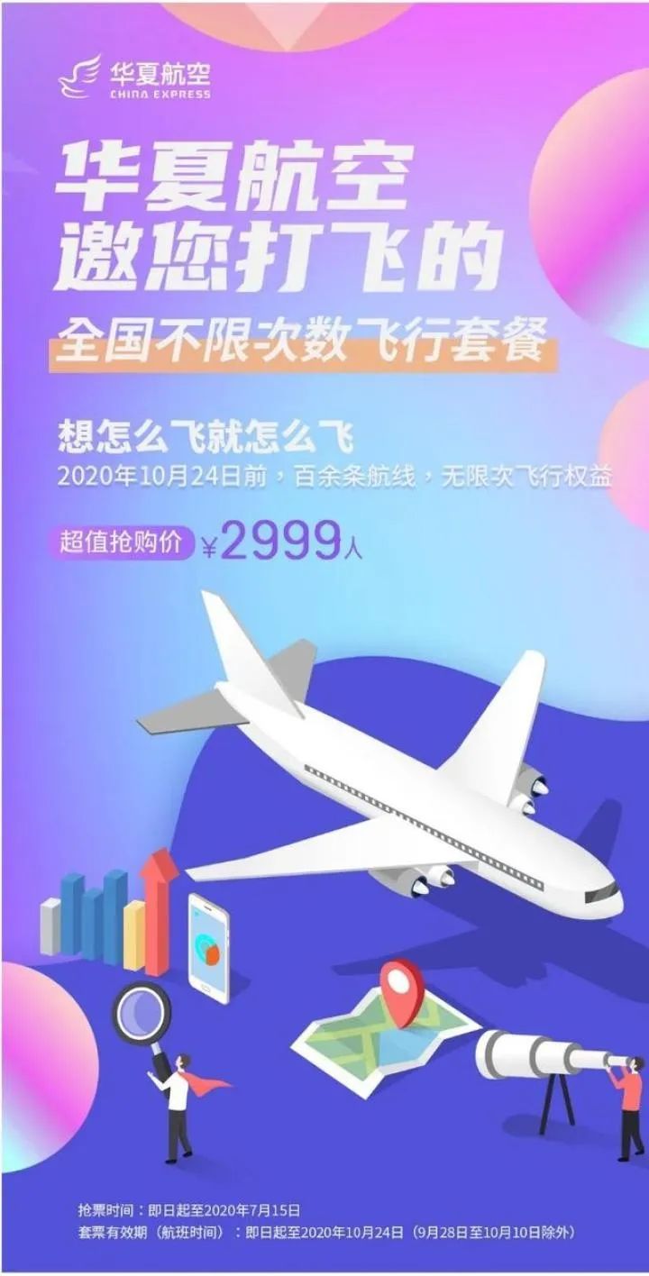 华夏航空: 全国不限次数飞行套餐,即日起到10月24日前(9月28日-10月10日除外),百余条航线,无限次飞行权益。价格是2999元。部分参考目的地城市:重庆、海口、丽江、长沙、扬州、银川、珠海、贵阳、福州、兰州、大连。