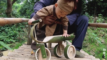 别人家小孩拿小瓶子吹泡泡,大爷直接给孙子做了个木头泡泡机。