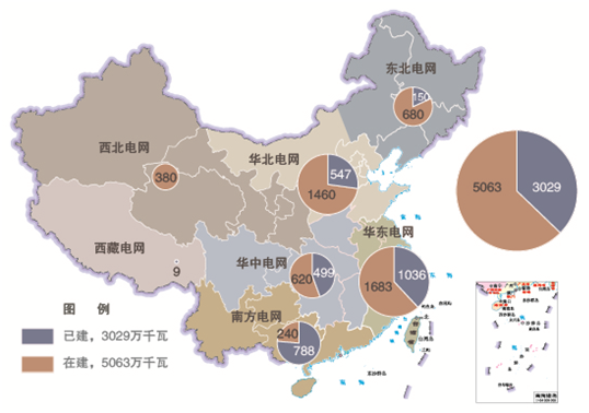 截至2012年底,全国水电装机容量24858万千瓦 (其中抽水蓄能2033万千瓦 ),居世界第一位 。