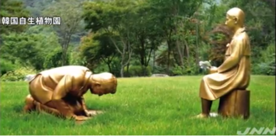据日本TBS电视台28日报道,韩国自生植物园本月25日宣布,该园在江原道五台山脚下建造的一座“安倍谢罪像”将于8月10日向公众开放。雕像显示,一名身高一米八左右的男性正低着头,双手触地,虔诚下跪。一名象征着慰安妇问题的“少女像”则坐在他的前方。