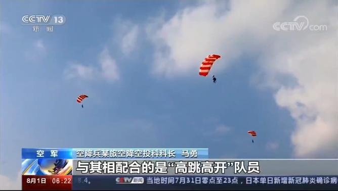 空降兵某旅空降空投科科长 马勇: 刚刚首先跳离飞机的是“高跳低开”队员,他们要在空中自由坠落15秒,手拉打开降落伞,达到垂直突袭目的,与其相配合的“高跳高开”队员,远距离进行高空渗透,最后双人伞队员通过挂带方式,将作战需要的非空降队员带入战场。