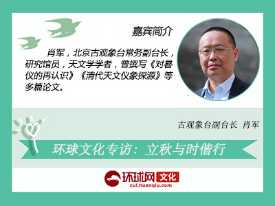 【环球网文化记者 张嘉玉】8月7日,立秋节气到来。环球网文化频道邀请北京古观象台副台长、天文学学者肖军,在立秋节气,追溯“古代皇家天文台和气象局”钦天监与二十四节气的历史渊源,重新寻回古人对时间文化的重视,“中国人是用时间构架了人与天地共存同构的系统——用时间将人与宇宙、与日月星辰达到天人合一的统一。把日子过好,实际上就是在完成我们的生命。”