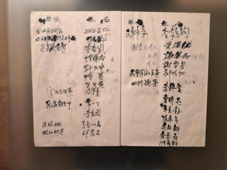 俞建国的捐赠中,还有一件特殊的当代“文物”。2012年,俞建国在逛上海旧货市场时,路过一个摆满旧杂志的摊位,他翻了翻没有什么感兴趣的物品。正要离开时,突然余光瞥到杂志堆一角摆着本灰蓝色封皮的笔记本,用透明塑料袋包着,封面写着“签到簿”三字。