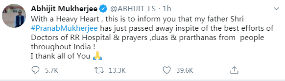 报道称,穆克吉的儿子阿比吉特·穆克吉在推特上发布了这个消息,“怀着沉重的消息通知你们,我的父亲普拉纳布·穆克吉刚刚去世了。”