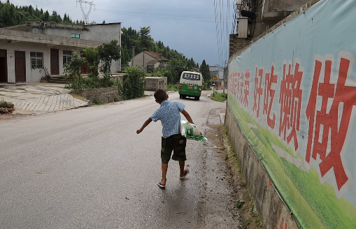 近日,记者在打纸村村口采访时遇到正在小卖部购买大米的小华,瘦小的身躯的他扛着20斤的大米走了一公里的路,休息了两次终于到了家。