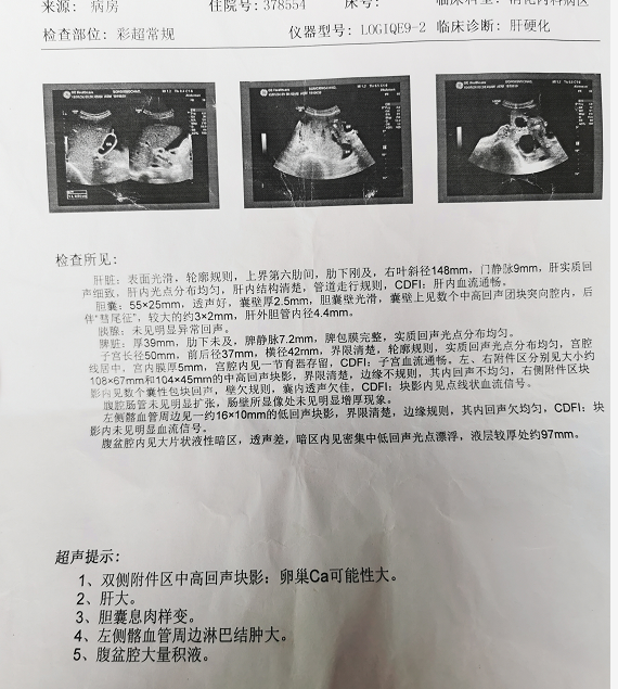 医生检查发现,她患有肝硬化以及卵巢癌等疾病,但到底是什么原因导致了肚子疯长,却没有一个定论。CT显示,她有肝硬化、脾大、腹水;左侧胸腔有少量积液;肝内胆管结石或钙化灶。