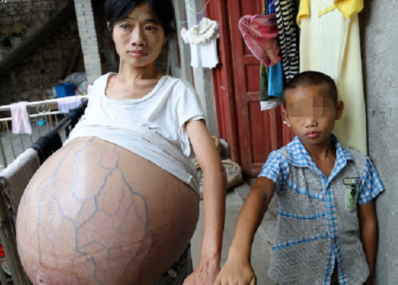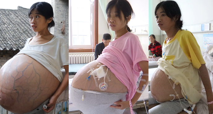 这个肚子俨然已成为了她的包袱。记者看到,她的肚子比怀胎10月的孕妇都要大得多,肚子上的皮肤已被撑得十分光滑, 各条血管十分明显。