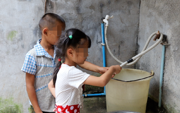 到家后,小华拿出妈妈刚刚换下的衣服洗了起来。洗完后又拿着水桶在一楼接水提往二楼倒在水缸里。母亲黄国娴说,小华每次只能提半桶水,每天要取10次水才能保证他们母子三人一天的基本用水。