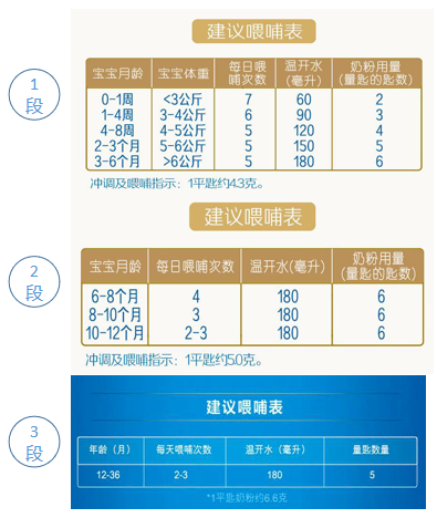 在配方奶的选择中,有妈妈们疑惑不同奶粉品牌奶粉罐上的宝宝推荐奶量是不一样的,同时随着宝宝年龄的增长,奶粉量推荐的趋势不一。在某购物网站上,任选两个奶粉品牌,其1段、2段、3段建议喂哺量,不难发现,不论是从月龄划分、温开水量、还是奶粉用量、喂哺次数都存在着差异。