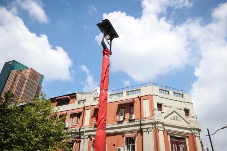 原来,1882年,上海第一盏弧光灯就在这里亮起,当时灯杆上的弧光灯在夜幕下闪亮,宛如明月。很多年来,这盏灯柱就立在这里,但被遮挡,没有多少人发现过。在东拓中,这段历史被挖掘、放大。灯柱下方立着一个铜版书,现在还被红布包裹着,据说上面镌刻着上海电力发展的历史,也将讲述上海第一盏弧光灯的历史。