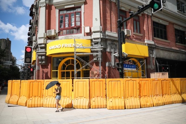 位于江西中路路口位置是“KAKAO Friends”,记者去的时候,外墙还被防护栏包围着,但黄色门头招牌已经露在外面了。“KAKAO Friends”是一个韩国知名IP品牌,以表情包为起点,售卖以RYAN、MUZI、APEACH、FRODO、NEO、TUBE、JAY-G、CON等主要角色为主题的多品类衍生品,具有年轻活力和鲜明色彩,为消费者提供新鲜乐趣。这次在东拓段开设的“KAKAO Friends”是内地首店,据说店铺颜值会很高,店内由黄色立体几何建筑与金色结构元素为主,中央上方调高空间会有一个金色的RYAN镜面球。