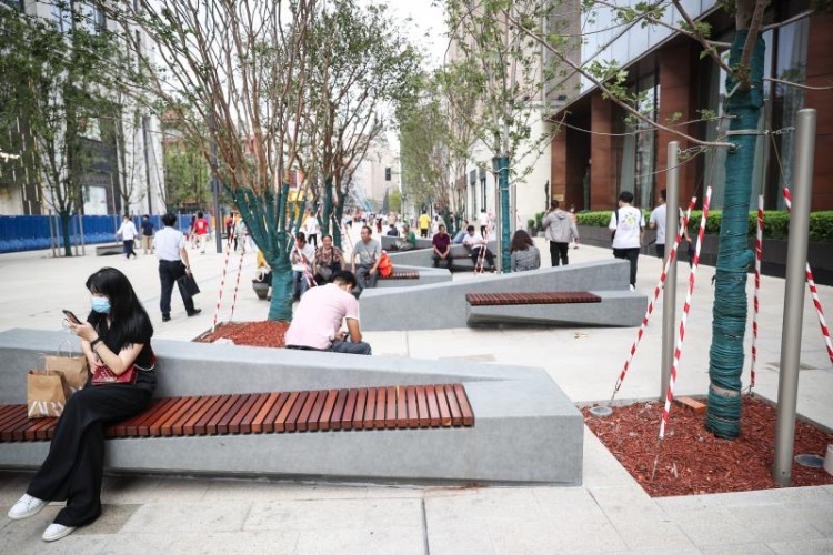 一路走、一路拍照,走累了可以坐下来,休息一会。走过江西中路路口,在艾迪逊酒店前,“Z”字形景观座椅已经安装完毕,坐了几位市民游客。石材座椅上配了木质坐垫,坐上去一点都不凉,座椅旁新栽种了数棵乔木,据说到深秋时枝干会茂盛起来,遮阳避日,也呈现多彩的园林景观。