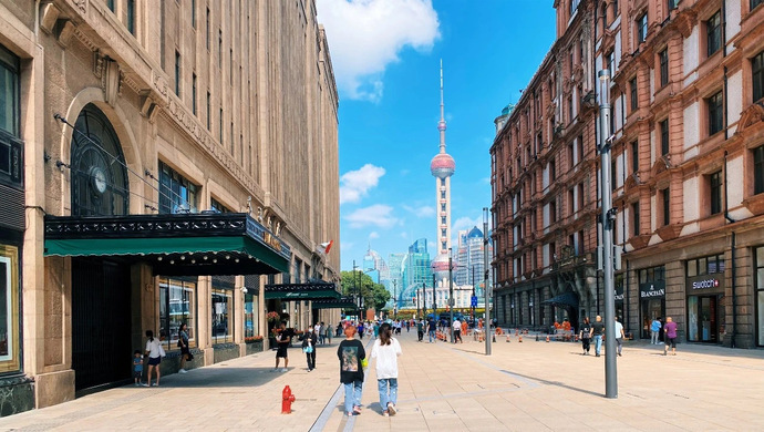 从中山东一路步入南京路步行街东拓段,立即觉得眼前开阔:车行道不见了,地面改为通往两边建筑的步行道,延伸下去;因为没有了遮挡,沿街历史建筑的轮廓更加凸显,取景拍照随手就是大片。