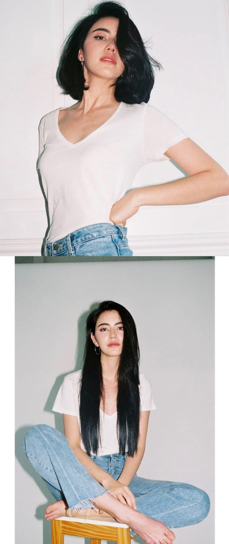纯色的白T恤,她会选择深V领的设计,搭配一条蓝色牛仔裤,整体简约纯粹的同时又透着纯欲的feel。