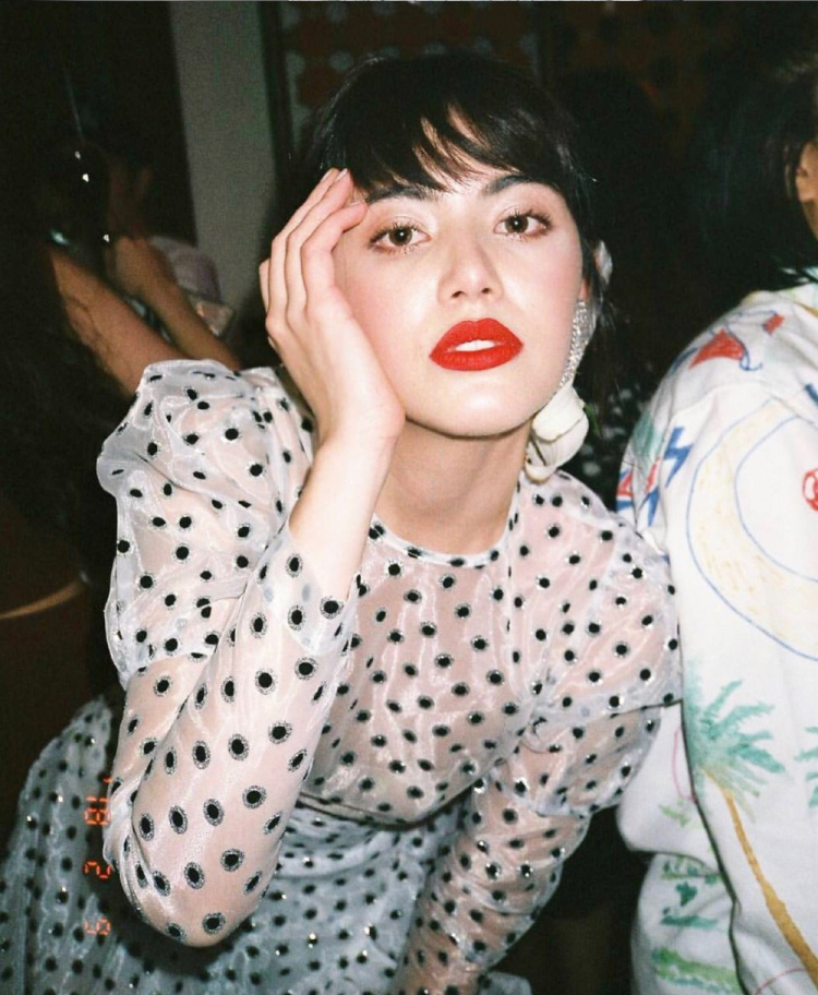 波点廓形的上衣配着红唇,与穿着白衬衫牛仔裤的她也形成鲜明的对比,从文艺女到时装精,这样的Mai简直比麻豆还百变。