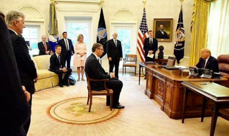 照片中,美国总统特朗普坐在白宫大办公桌后的老板椅上,访美的塞尔维亚总统武契奇,则坐在他面前的一张小椅子上。