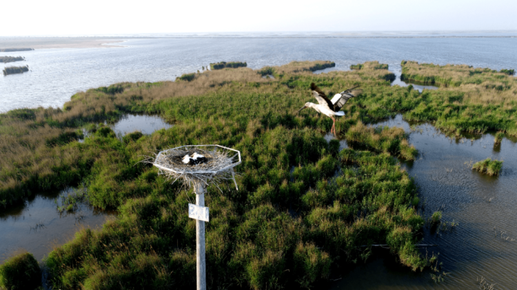 东方白鹳在黄河口筑巢栖息(摄影:东营广播电视台杨斌)