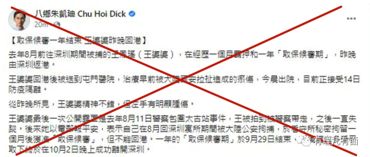 直到近日,由前反对派立法会议员朱凯迪的个人社交账号以及“毒果日报”的报道中才看到,原来这位“知名王婆”,去年8月中旬就被深圳公安以寻衅滋事罪刑拘,后取保候审满一年后,今年10月2日才返回香港。