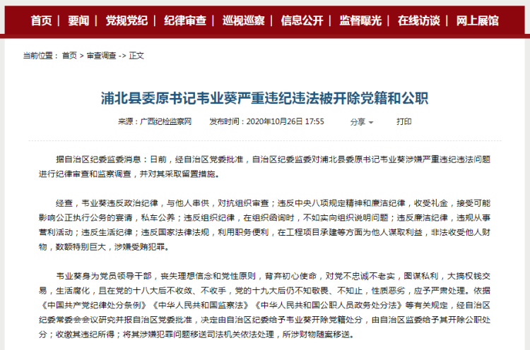 据自治区纪委监委消息:日前,经自治区党委批准,自治区纪委监委对浦北县委原书记韦业葵涉嫌严重违纪违法问题进行纪律审查和监察调查,并对其采取留置措施。