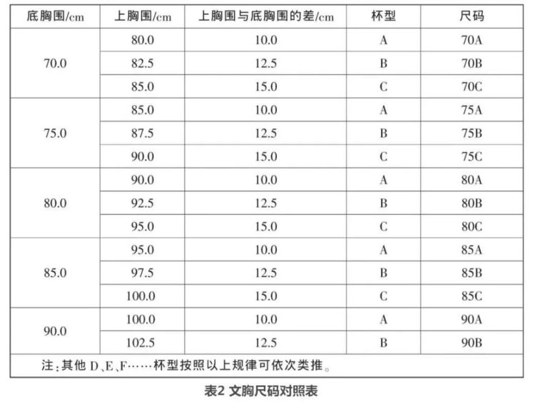 罩杯是文胸承托胸部的部分,由一系列大写字母表示,是人体最大胸围(上胸围)减去下胸围之差,一般来说,上下差在10厘米左右选择A罩杯,每增加2.5厘米,依次增加一个杯型,如B、C、D、E和F等(见表2)。