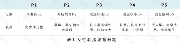 乳房作为女性其中一个性征,从儿童期到成年期按照女孩乳房发育性成熟分级(Tanner分期法) 可分为5期,分别见图1和表1。