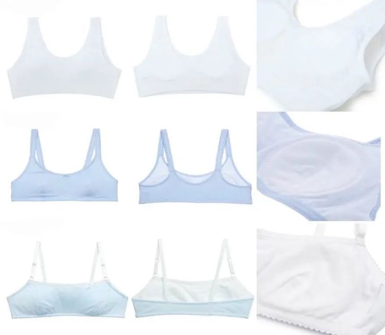 少女文胸一定要选择柔软的、简单的弹性棉面料,不选择花哨或蕾丝的文胸,也不需要有杯垫。下图是我在某商场找到的文胸背心的款式,大家可以参考一下。