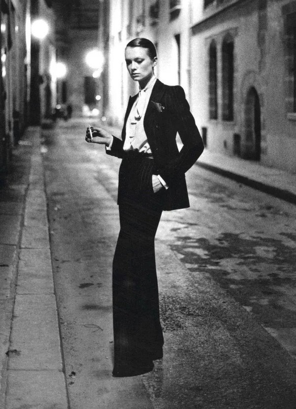 而Yves Saint Laurent吸烟装诞生的1960年代,女性自我权力的觉醒在长期积压之后迎来了大爆发,女性不能穿裤子的条例彻底被打破,原本只属于男性宴会吸烟后穿着的吸烟装出现在了女性身上,而街上也到处都是穿裤子的女人。