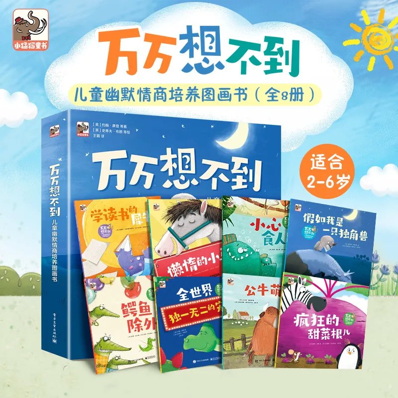 《万万想不到》这套书一共8册:《鳄鱼除外》、《懒惰的小马》、《疯狂的甜菜根》、《公牛萌宠》、《全世界独一无二的宠物》、《假如我是一只独角兽》、《小心食人鱼》、《学读书的犀牛》。